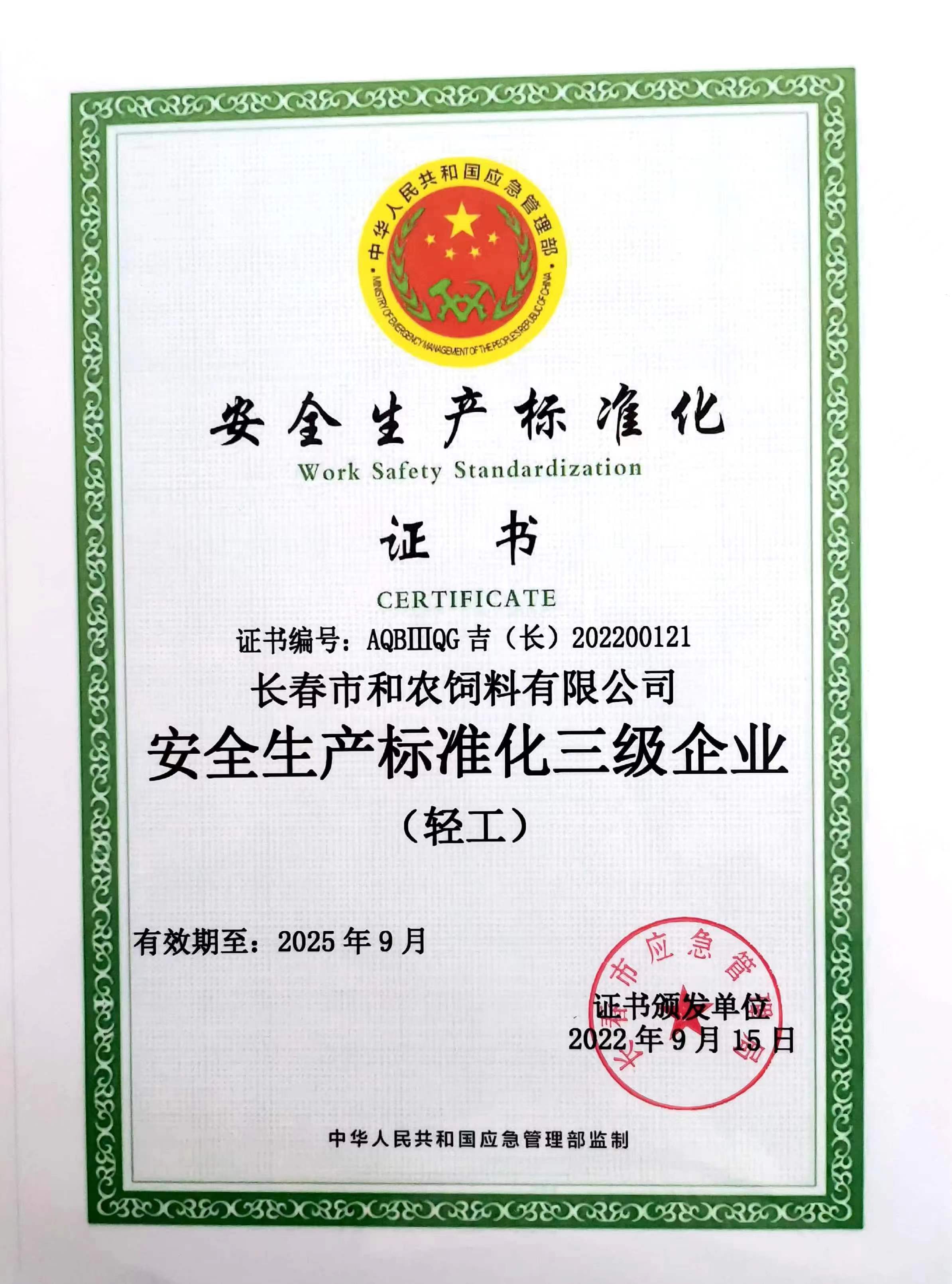 和農(nóng)牧業(yè)集團下屬公司 長春市和農(nóng)飼料有限公司榮獲由長春市應(yīng)急管理局頒發(fā)、中華人民共和國應(yīng)急管理部監(jiān)制的“安全生產(chǎn)標準化三級企業(yè)”證書,標志著長春和農(nóng)飼料安全生產(chǎn)標準化建設(shè)邁上新臺階。
